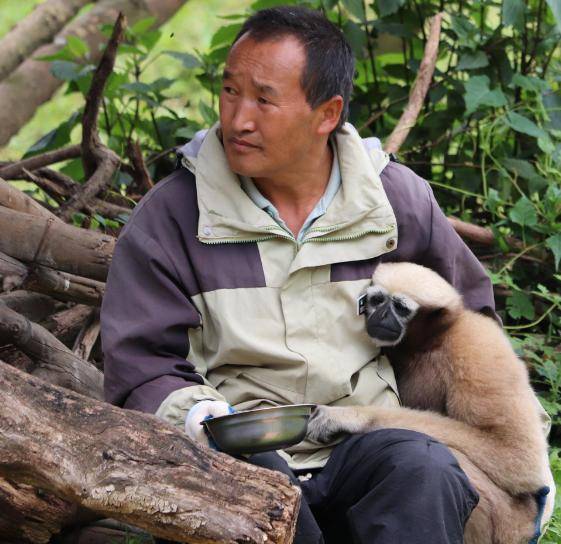 饲养员在给白眉长臂猿喂食。 记者字剑飞摄