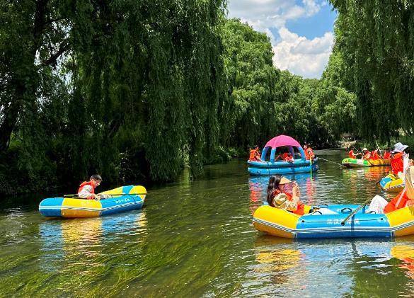 r夏日的洒渔河奔涌着清凉活力,漂流河道上,橡皮艇载着欢声笑语顺流而下,时而在湍急处激起雪白浪花,时而在平缓水面悠然徐行。两岸垂柳轻拂,远处青山如黛,构成一幅灵动的山水画卷。“太好玩了!特别是浪花打过来,瞬间暑气全消。和家人一起尖叫、大笑,特别喜欢这种亲近自然的快乐。”前来避暑的游客李先生兴奋地说。